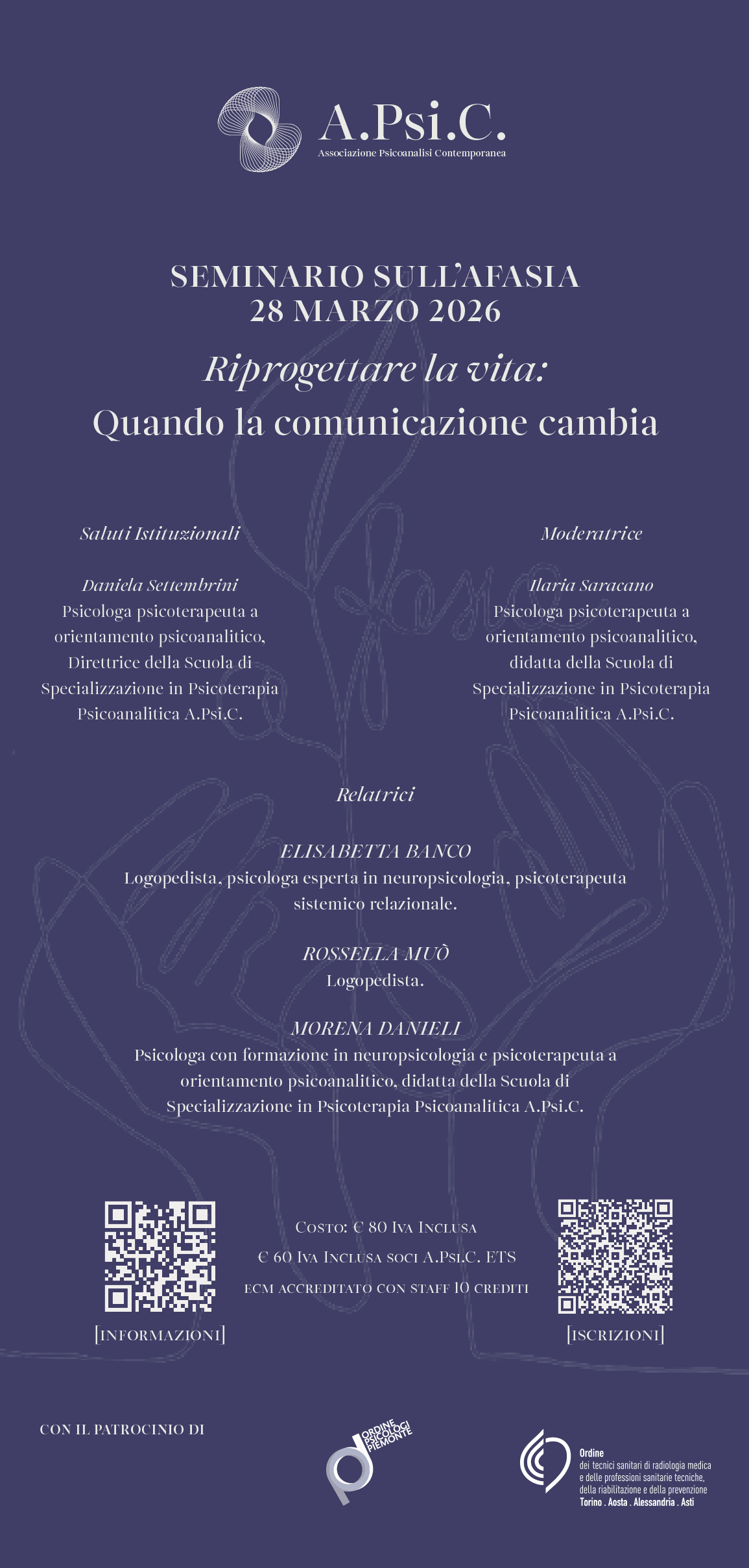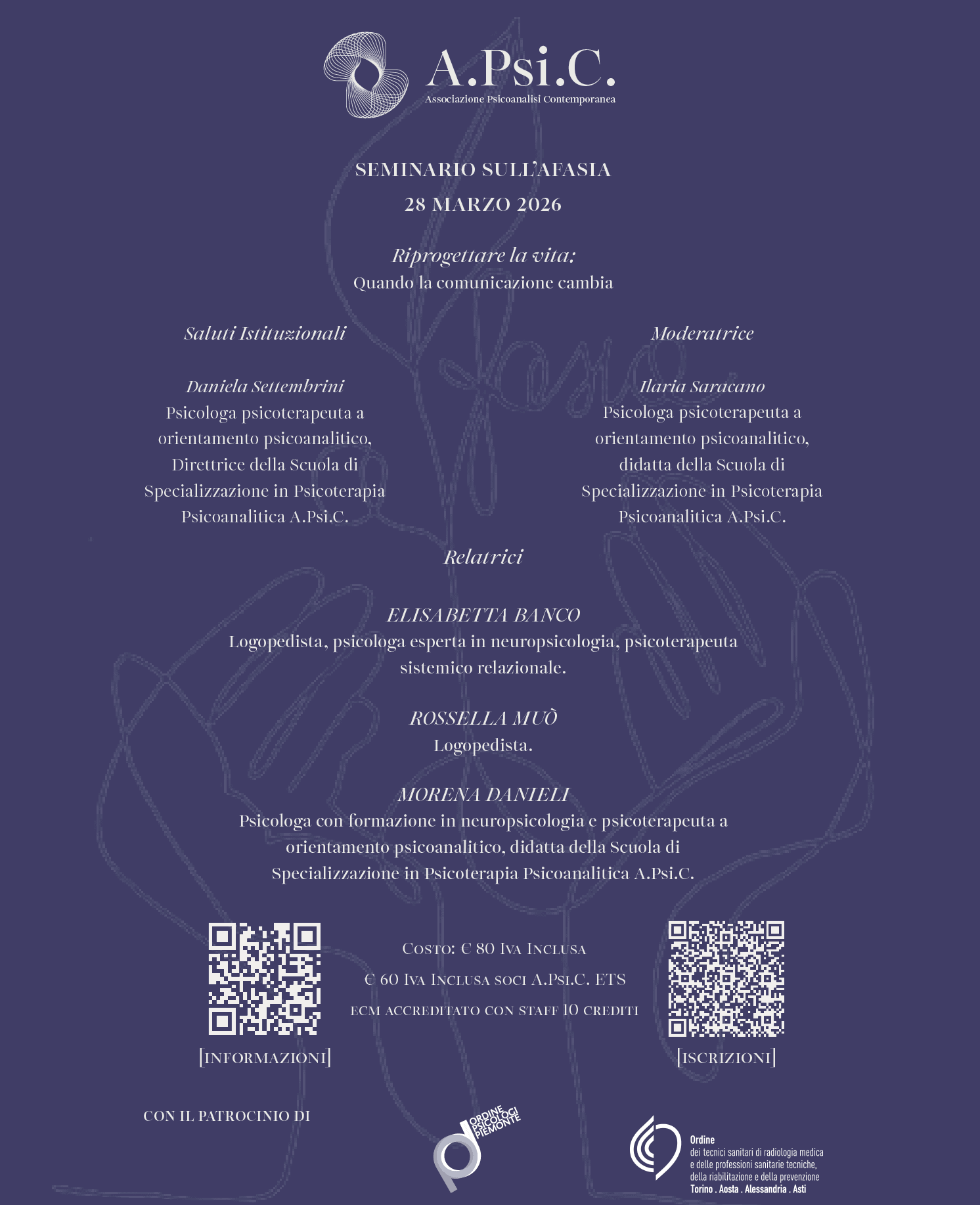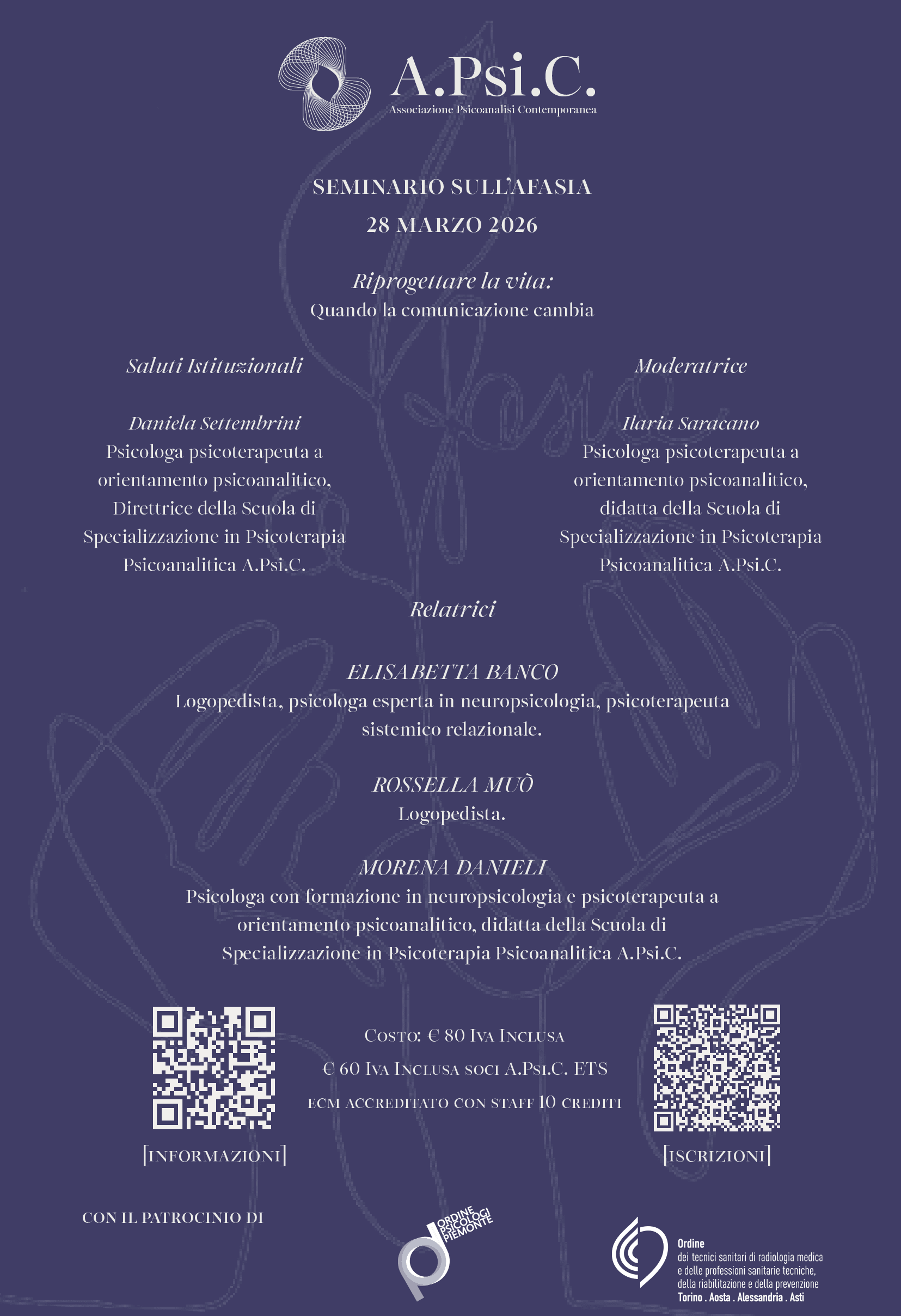 Nell'ambito di A.Psi.C. OFF, si propone un ciclo di quattro seminari che affrontano i temi fondanti della clinica psicoanalitica in chiave contemporanea. Ciascun seminario, condotto da clinici di fama, si suddivide in una parte teorica e, successivamente, nella presentazione di un caso clinico con un lavoro pomeridiano di discussione e rielaborazione. Il lavoro pomeridiano si svolgerà in piccoli gruppi per promuovere il “saper essere” e il “saper fare” nella conduzione della cura.